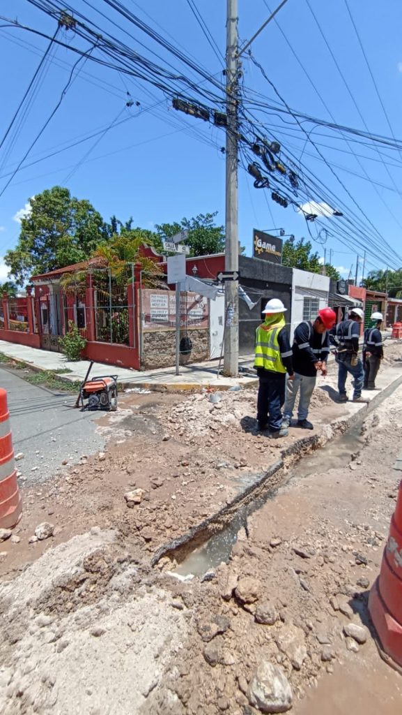 Personal de la Japay atendió ayer 18 de mayo una fuga en una tubería de seis pulgadas ocasionada en la calle 75 por 42 de la colonia Montes de Amé por una empresa a cargo de la construcción de un gasoducto en dicha zona.