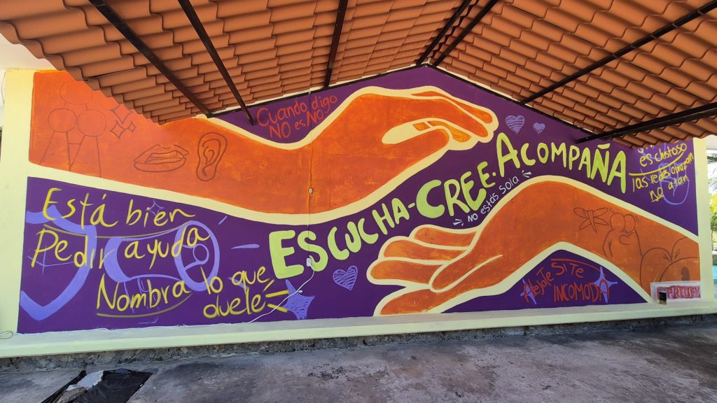 Este proyecto artístico, desarrollado en conjunto con estudiantes de la institución, tuvo como eje temático la prevención de las violencias contra las mujeres, y se realizó durante una semana, en la cual las y los adolescentes participaron activamente, plasmando sus ideas y reflexiones en imágenes y frases que promueven el respeto, la equidad y la no violencia.