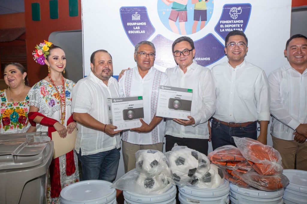 Previo al concierto de la orquesta, en el domo municipal, el funcionario hizo entrega de ocho kits del programa “Mejora tu Secu” a igual número de escuelas del municipio que incluyen: material audiovisual, de mantenimiento y deportivo para los planteles.
