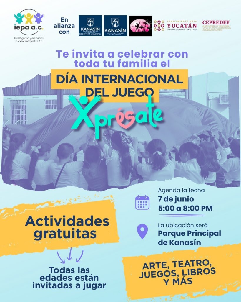 ¡Jugar también es un derecho! Para celebrarlo, el Centro Estatal de Prevención Social del Delito y Participación Ciudadana del Estado de Yucatán (CEPREDEY) se une al Día Internacional del Juego con la jornada “Xprésate”, que tendrá lugar este sábado 7 de junio, de 4:00 a 7:00 p.m., en el Parque Principal de Kanasín.