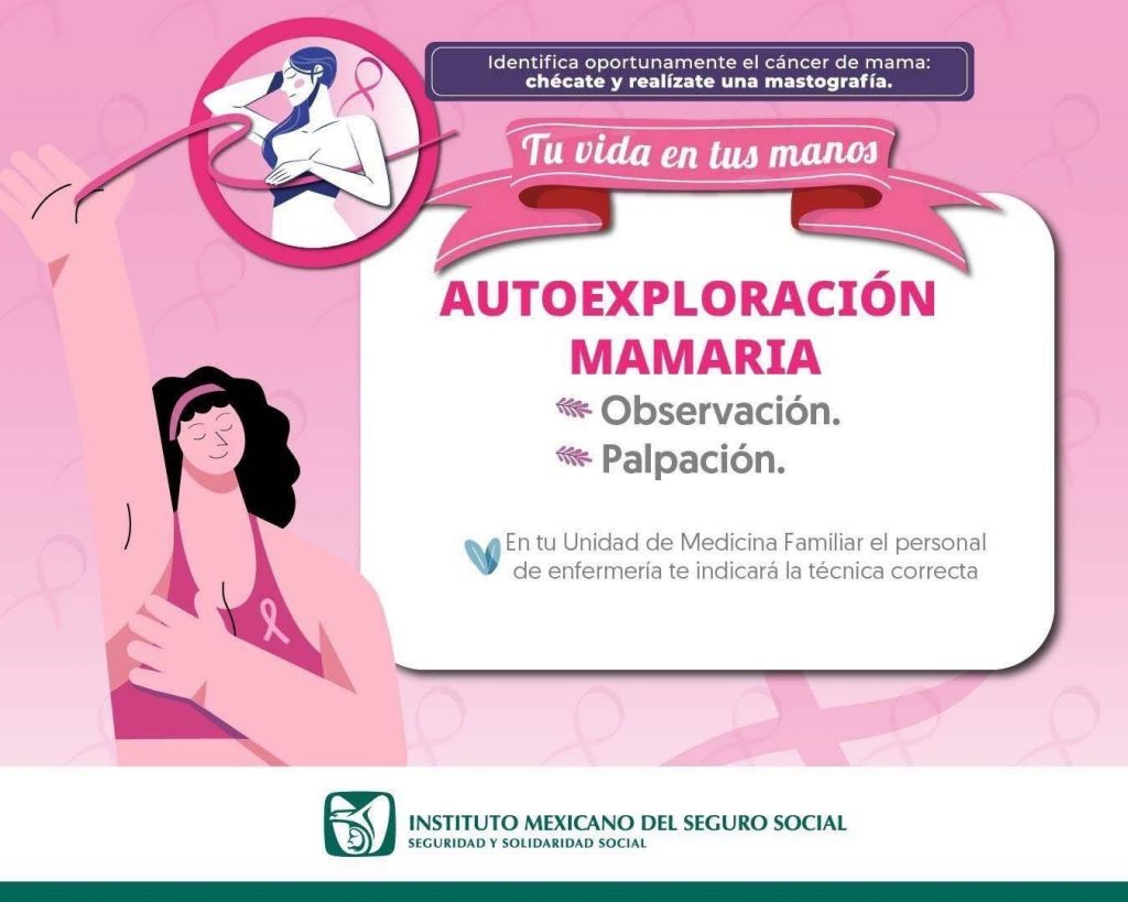 Con el objetivo de reforzar en las mujeres el cuidado integral, el Instituto Mexicano del Seguro Social (IMSS) en Yucatán orienta sobre la autoexploración mamaria y otras estrategias que permiten la detección temprana del cáncer de mama, así como de otras anomalías en etapa inicial, lo que permite mejores pronósticos en los tratamientos y salva vidas.
