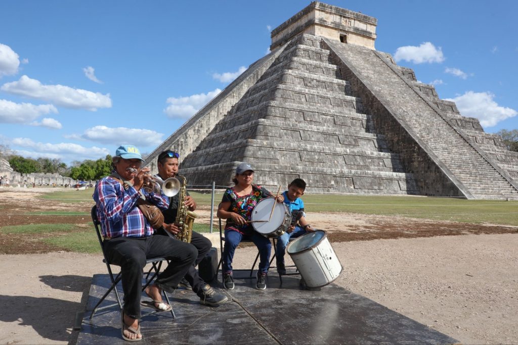 Los acordes de la Charanga Hermanos Canul, originaria de Yaxunah, dieron la bienvenida a Kukulcán en punto de las tres de la tarde. Jóvenes jaraneros bailaron a los pies de la pirámide erigida en honor al dios maya y, a las 16:50 horas, tras una breve pausa, la deidad arribó nuevamente a su tierra rumbo al cenote sagrado.