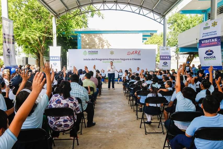 Mérida, Yucatán, jueves 26 de septiembre de 2024.Como herramienta clave para fortalecer la cohesión social en Mérida, la Presidenta Municipal Cecilia Patrón Laviada inauguró el programa “Regreso Seguro a Clases con D.A.R.E”, un modelo educativo que imparte la Policía Municipal con el objetivo de prevenir las adicciones y la violencia entre la población estudiantil.
