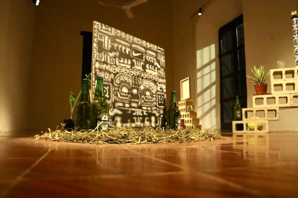 La muestra se compone por obras de los artistas Alejandro Manzanero, Valeria Sánchez, Marian Roma y Emilio Morales, bajo la curaduría de César Rendón, quienes utilizan materiales comunes para construir escenarios que evocan al monte traído al interior de la galería.