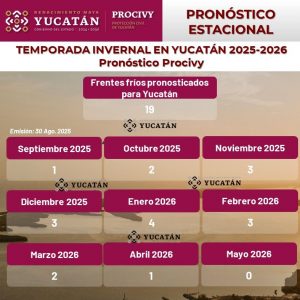 Agregó que el 15 de septiembre inicia la temporada invernal 2025-2026, que se extenderá hasta el 15 de mayo próximo y explicó que a nivel nacional se esperan alrededor de 50 sistemas frontales, de los cuales al menos la mitad tendrá influencia en la Península de Yucatán.