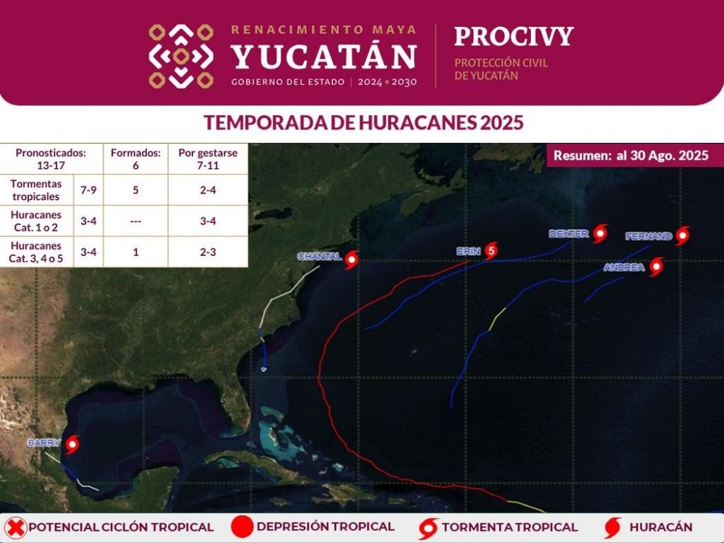 Hernández Rodríguez detalló que hasta la fecha se han formado seis sistemas tropicales con nombre en el Atlántico, Golfo de México y Mar Caribe: cinco tormentas tropicales, Andrea, Barry, Chantal, Dexter y Fernand, y un huracán categoría 5, Erin, de los cuales ninguno representó riesgo para Yucatán.