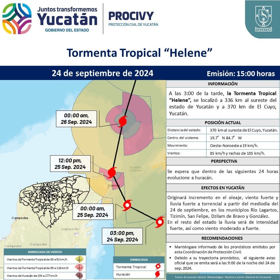La Coordinación Estatal de Protección Civil (Procivy) precisó que al comenzar a retirarse “Helene”, el nivel de alerta ahora es de Amarilla de alejamiento para las comunidades de San Felipe, Río Lagartos, Panabá, Calotmul, Sucilá, Espita, Buctzotz y Tizimín.